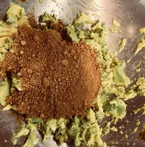 - Σ΄ένα μπολ προσθέτετε τα αβοκάντο και τα διαλύετε με ένα πηρούνι και στη συνέχεια το κακάο και ανακατεύετε.